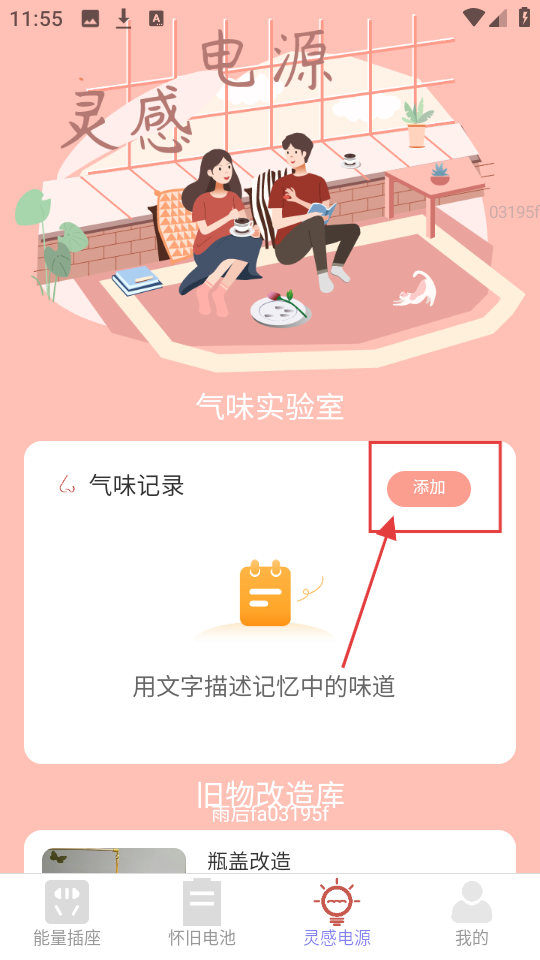 3、在灵感电源页,进入气味实验室,若要记录气味,点【添加】按钮,开始记录记忆中的味道。