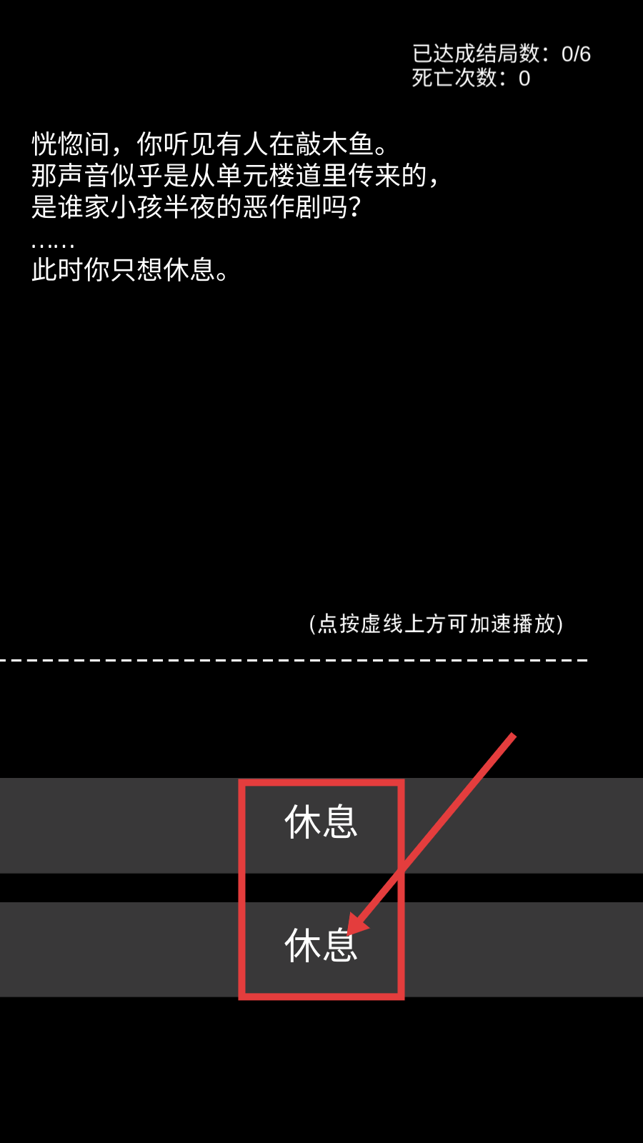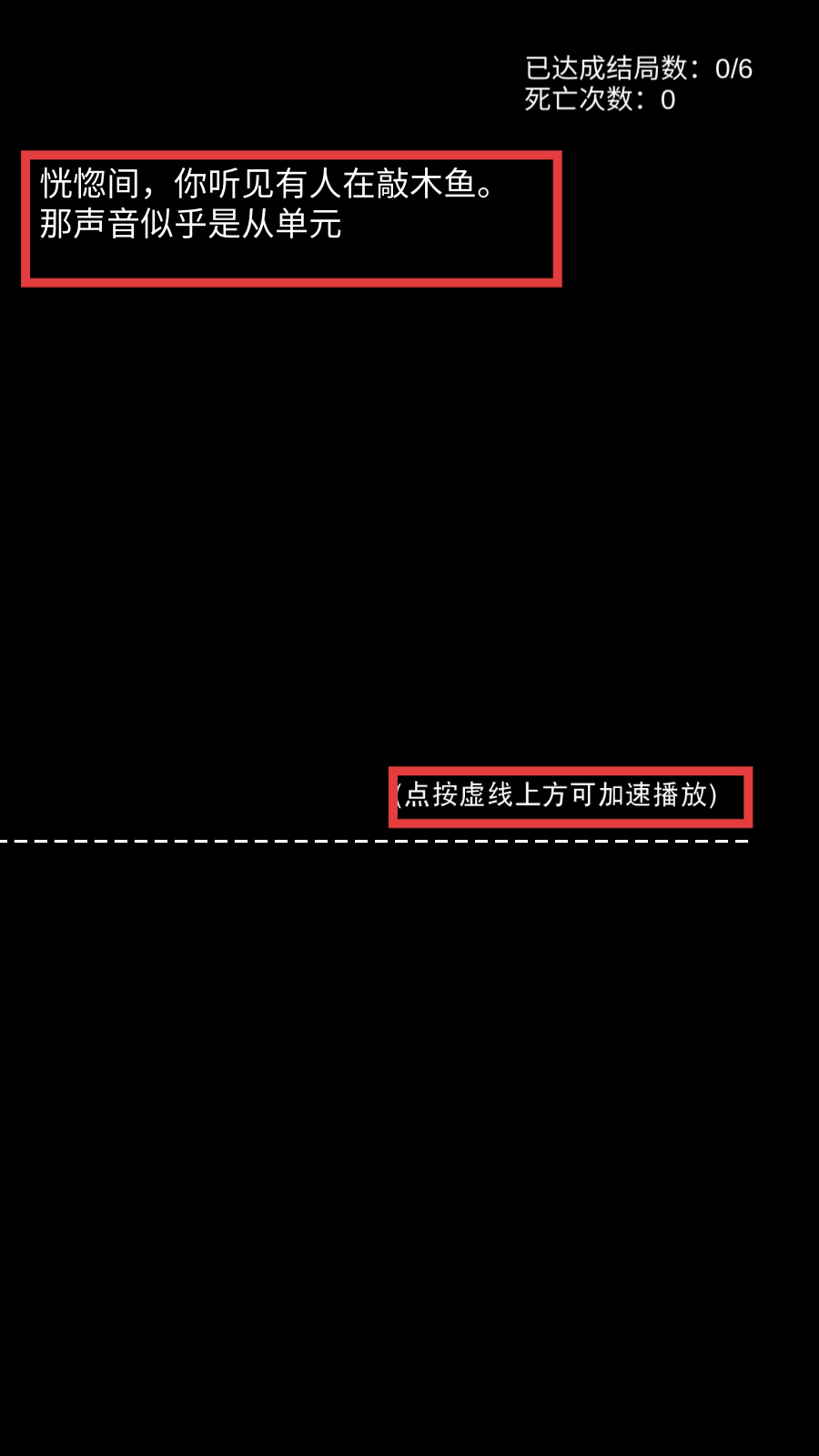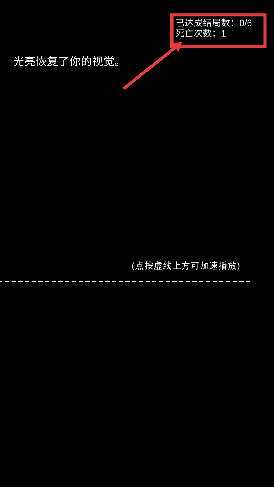 4、留意右上角的【已达成结局数-0/6】和【死亡次数-1】,可通过不同选择解锁结局、积累死亡次数来探索游戏。