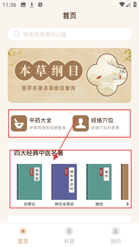 1、进入首页,可通过搜索找古籍,也能查看【中药大全】【经络穴位】,还能选四大经典中医名著阅读。