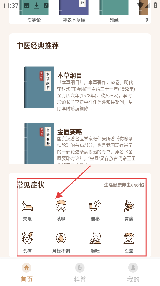 3、在中医经典推荐下,有常见症状分类,像【失眠】【咳嗽】等,可点击对应症状查看调理方法。