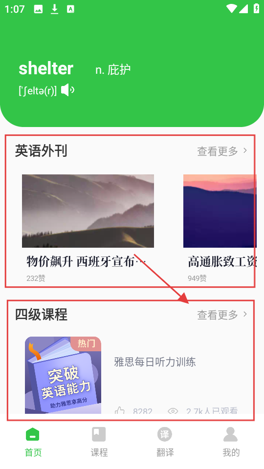 1、进入首页,可学单词【shelter】,还能看英语外刊,若想提升四级,点四级课程【查看更多】找相关课。
