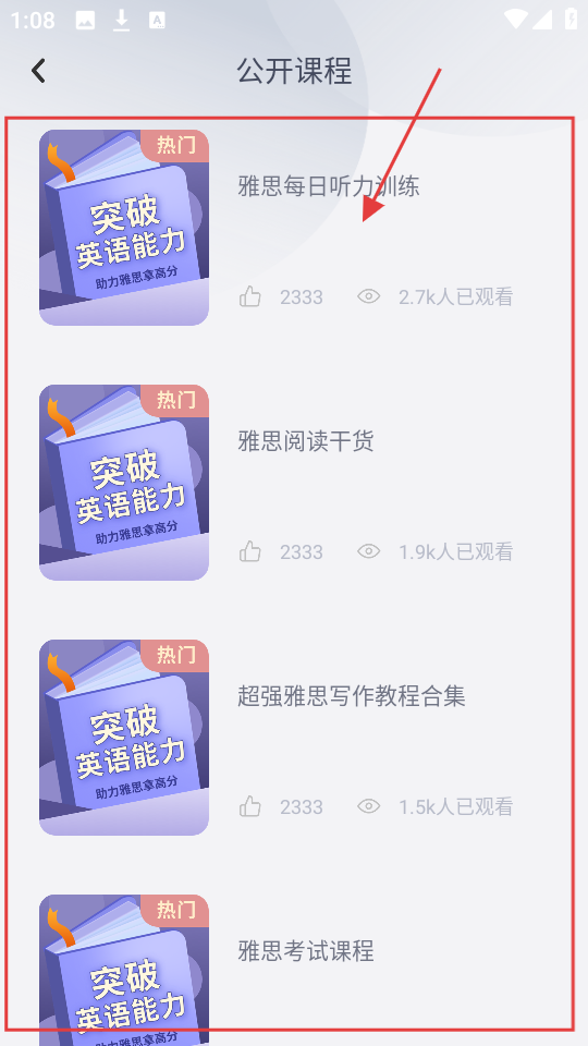 2、进入公开课程页,有【雅思每日听力训练】【雅思阅读干货】等课,选感兴趣的课学习雅思知识。