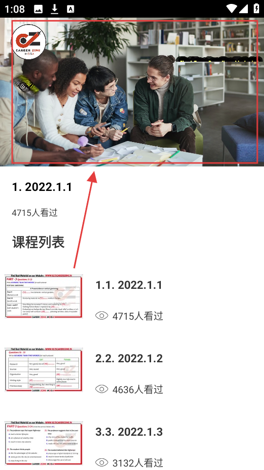 3、在课程详情页,能看到课程相关图片和课程列表,选对应日期课程,查看学习人数,开始学习。