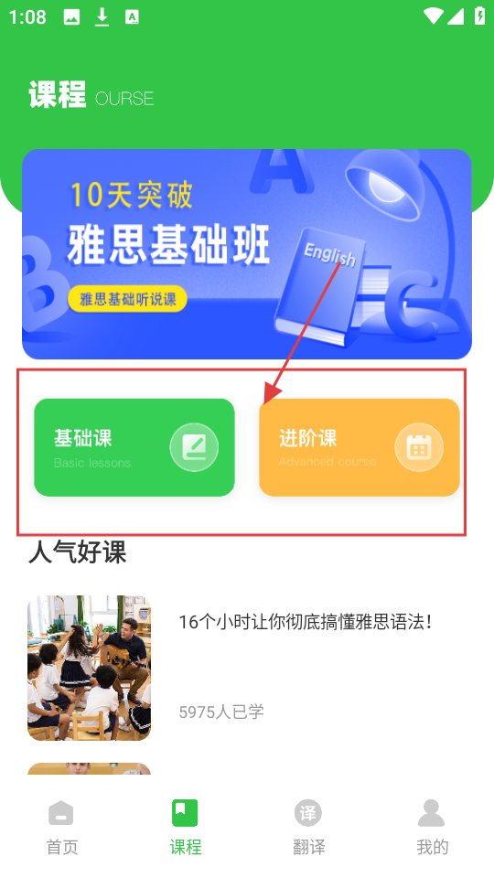 4、在课程页,有【基础课】和【进阶课】可选,根据英语水平选,还能看人气好课,挑喜欢的学习。