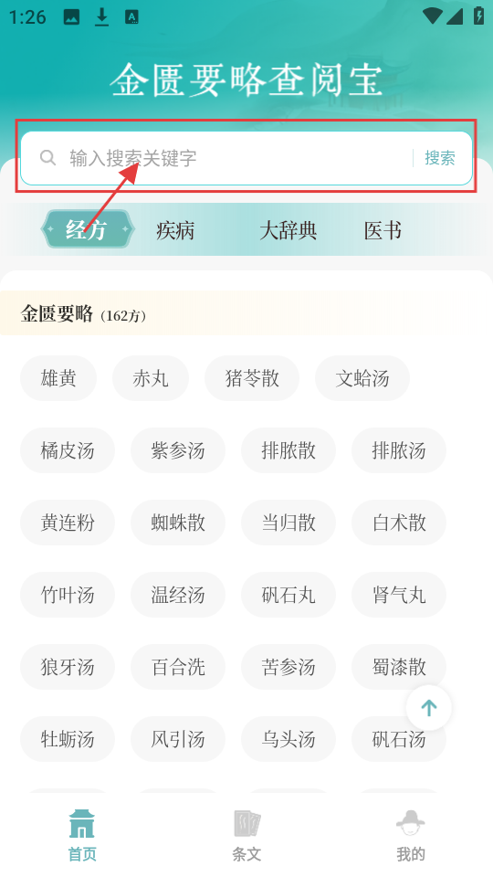 1、在金匮要略查阅宝首页,可在搜索框输关键词,也能从经方等分类里找,比如【雄黄】【赤丸】等经方。