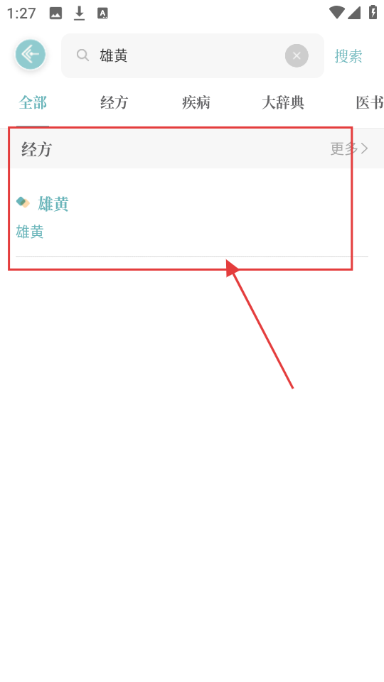 3、搜索【雄黄】后,在结果页经方分类下找到【雄黄】,点进去查看详细的经方信息。