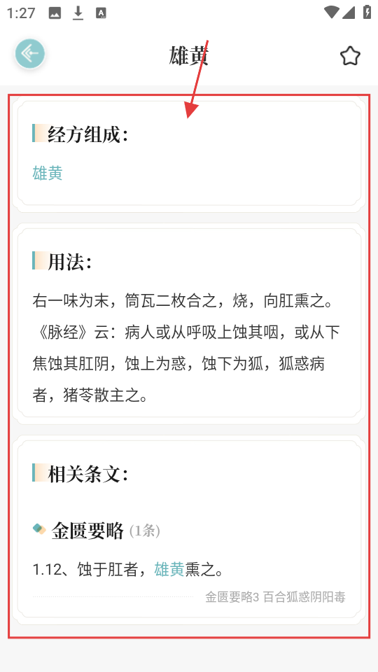 4、进入【雄黄】详情页,能看到经方组成、用法和相关条文,仔细阅读,了解雄黄经方的具体内容。