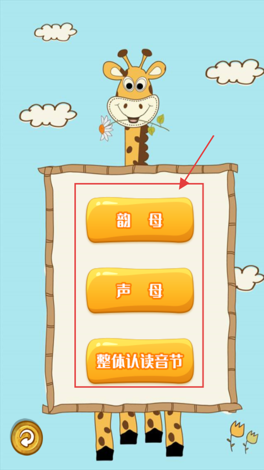 2、进入选择界面,有【韵母】【声母】【整体认读音节】选项,选要学习的类别,进入对应拼音学习。