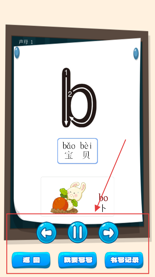 4、学习声母【b】时,看书写笔画,听示例读音【bǎobèi-宝贝】等,还能点【我要写写】练习书写。