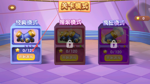 3、如何选择玩法?在关卡、经典、摇滚、疯狂四模式中任选其一,查看0/12等进度后点对应的“开始游戏”。
