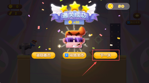 1、如何结算奖励?通关后界面显示50,点“下一关”继续,或点“双倍金币”再领一次高过本关的50金币。