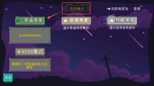 2、如何选择难度?在选择模式界面查看当前难度为普通,点击普通难度即可开始,困难与残酷需通关后解锁。