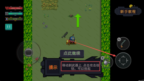 4、如何完成新手教程?根据提示移动到武器上,点击攻击按钮即可捡起武器,再点“点此继续”完成教程。