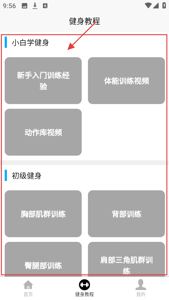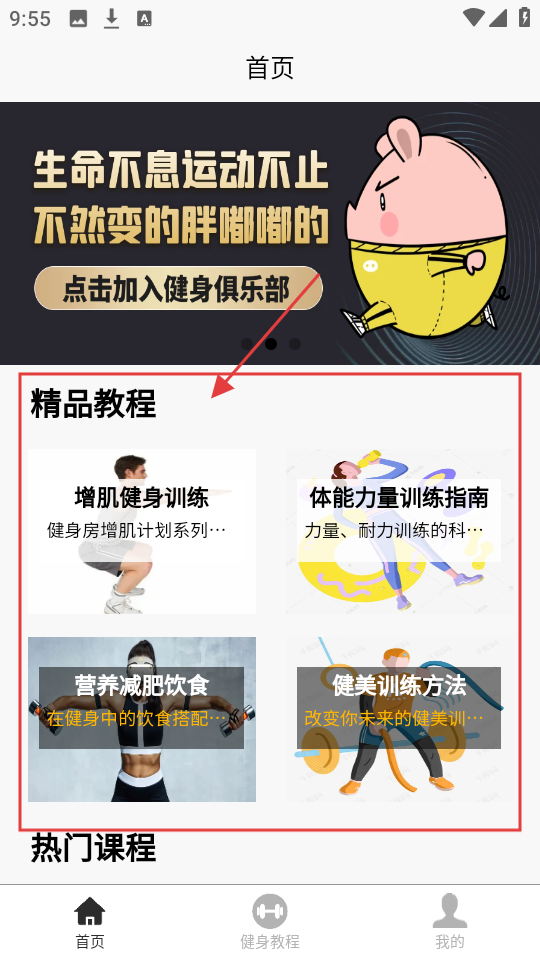 1、进入应用首页,有【精品教程】板块,含【增肌健身训练】等,选感兴趣教程,开启健身学习。