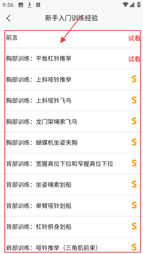 3、选【新手入门训练经验】,可看【前言】【胸部训练-平板杠铃推举】等,部分内容可试看,学习入门经验。
