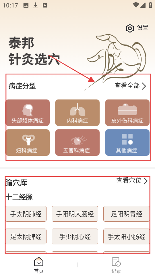 1、进入应用首页,有【病症分型】【腧穴库】等板块,可根据需求选病症或查看腧穴,开启针灸学习。