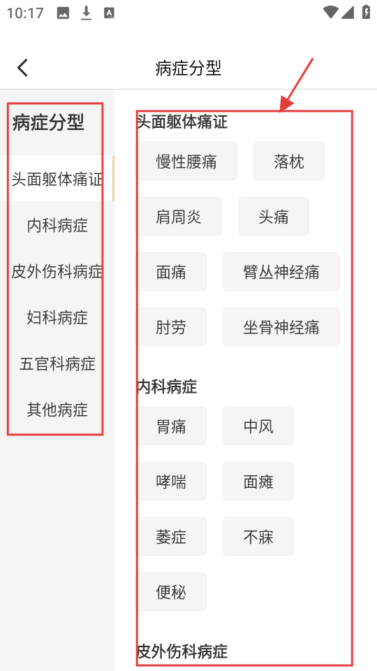 2、进入病症分型页,有【头面躯体痛证】【内科病症】等分类,选对应病症类型,查看具体病症。