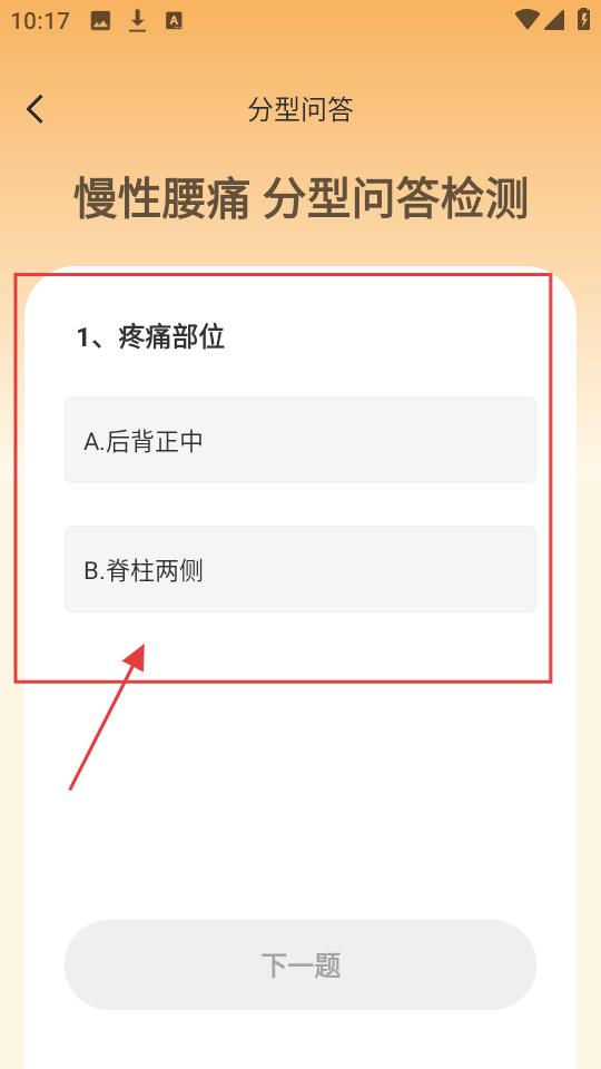 3、选【慢性腰痛】后,进入分型问答检测,按题目如【疼痛部位】选答案,完成检测了解分型。