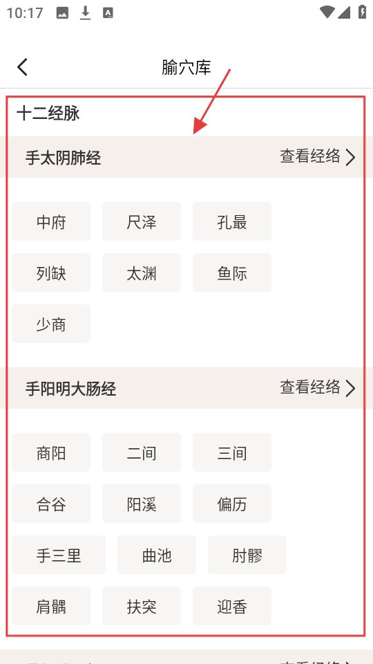 4、在腧穴库页,有【十二经脉】下的各经络,如【手太阴肺经】【手阳明大肠经】,选经络查看腧穴。