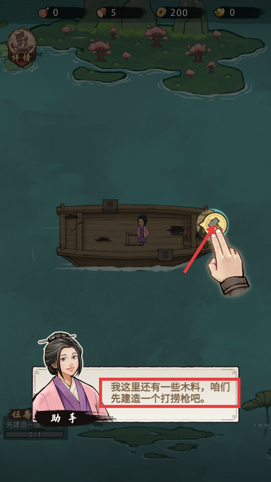 2、冒险初期,听从助手建议,当出现建造打捞枪提示时,若有足够木料,点击【建造】按钮打造打捞枪,用于打捞漂流物。