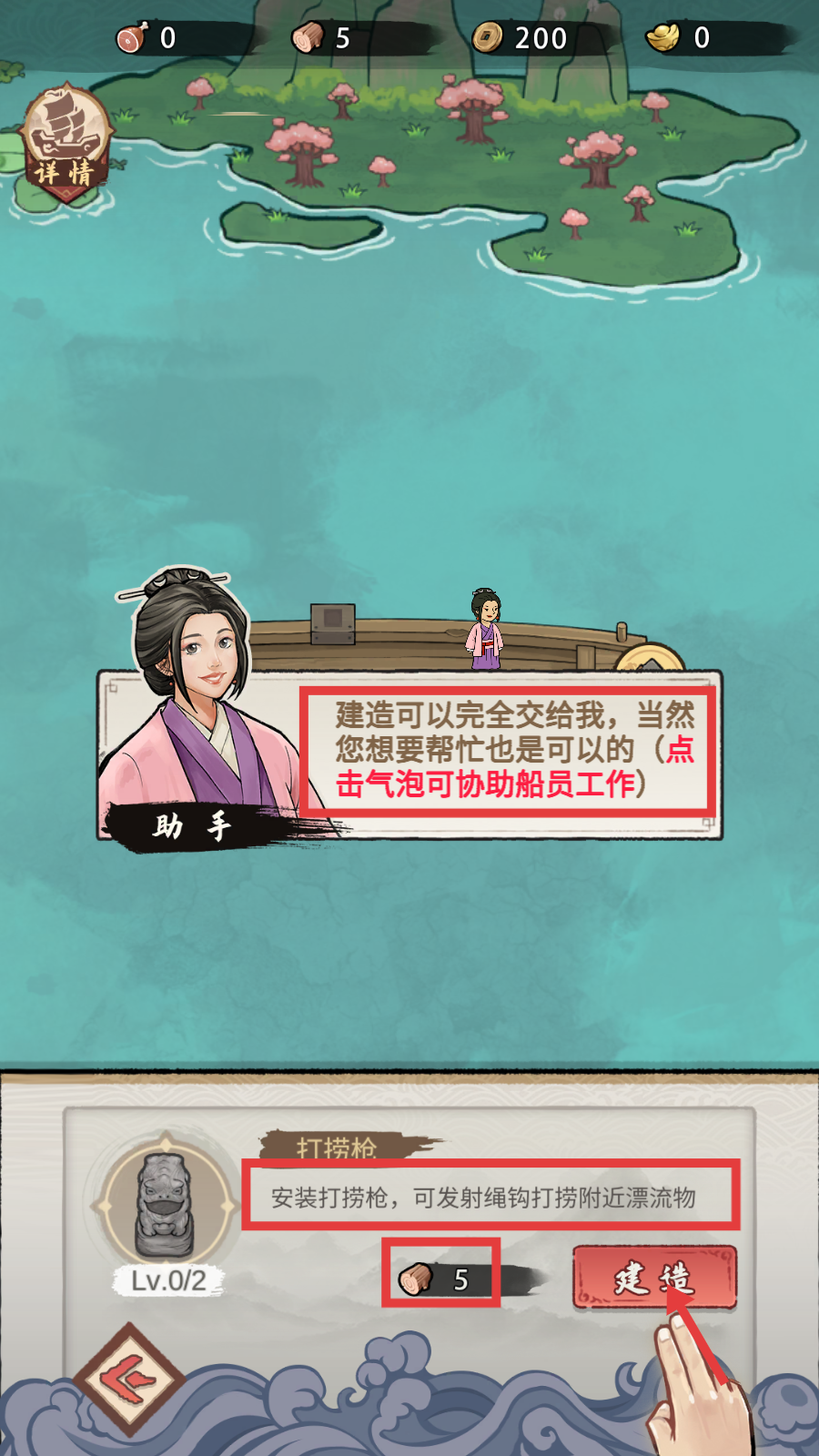 3、在建造过程中,留意气泡提示,点击气泡协助船员工作,能加快建造进度,节省时间。