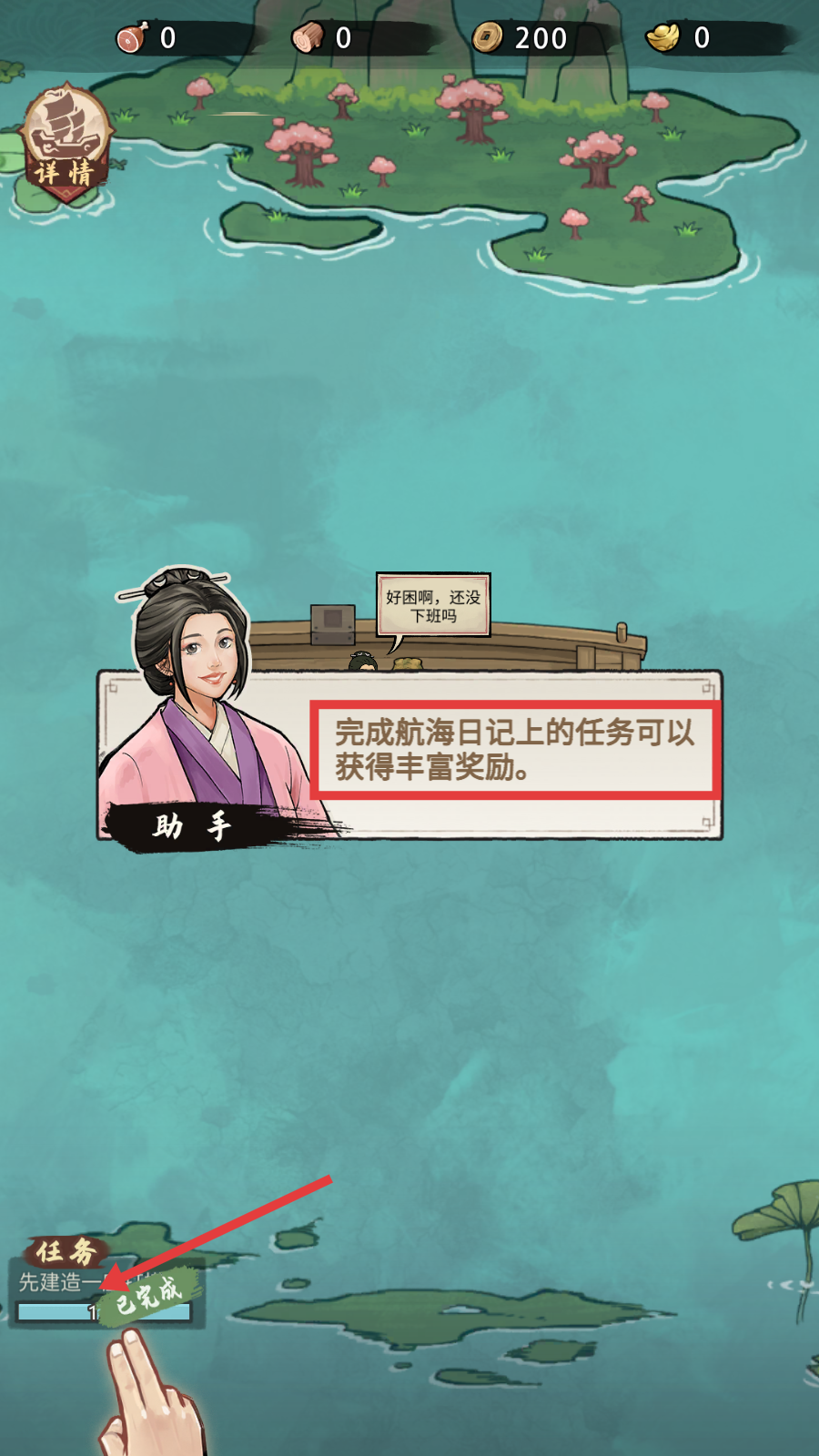 4、完成建造后,关注屏幕下方的【任务】板块,完成航海日记上的任务,获取丰富奖励,推动游戏进程。