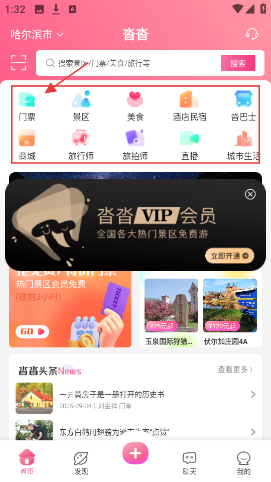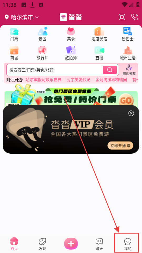 1、进入应用首页,有【门票】【景区】等功能入口,可搜景区、门票等,还能开通VIP会员享热门景区免费游。