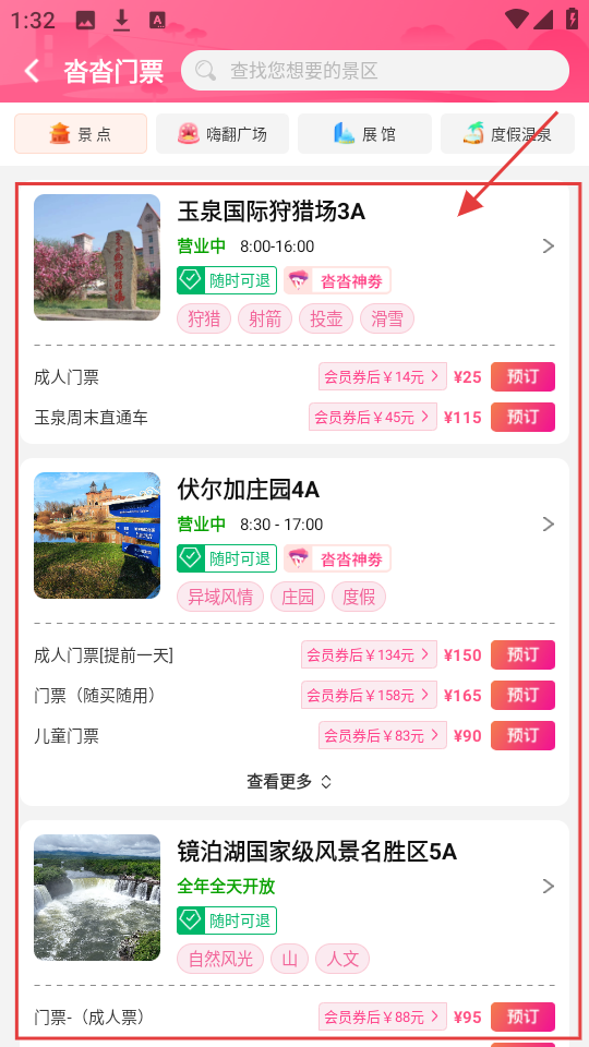 2、进入沓沓门票页,有【玉泉国际狩猎场3A】等景区门票,可查看价格、营业时间,选合适的预订。