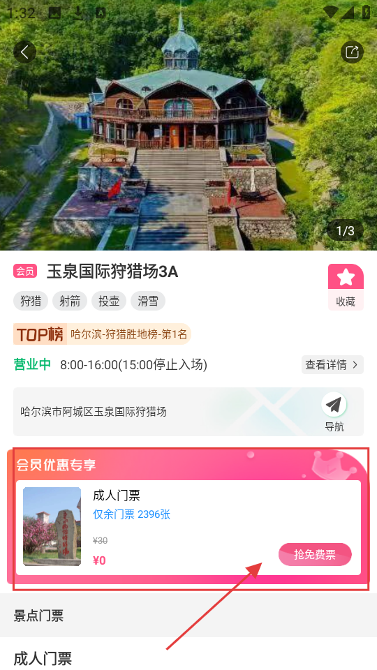 3、在玉泉国际狩猎场3A详情页,看景区介绍,若有会员优惠,点【抢免费票】,争取免费入园。