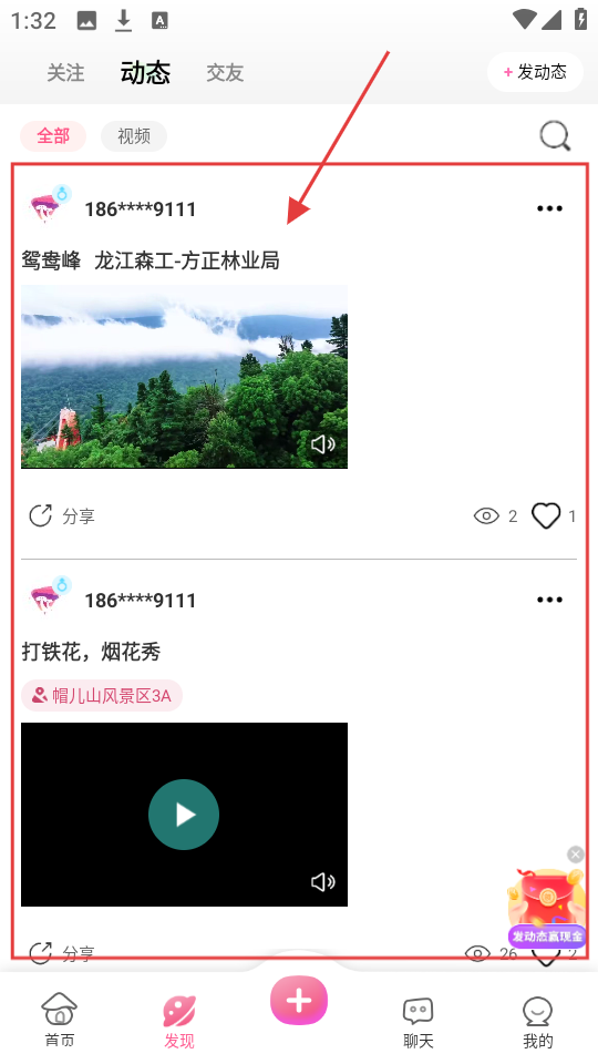 4、切换至发现页动态栏,看用户分享的【鸳鸯峰】等景点内容,了解景点情况,为游玩做参考。