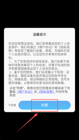 1、首先,阅读并同意游戏的隐私政策和用户协议,点击“同意”按钮以继续。