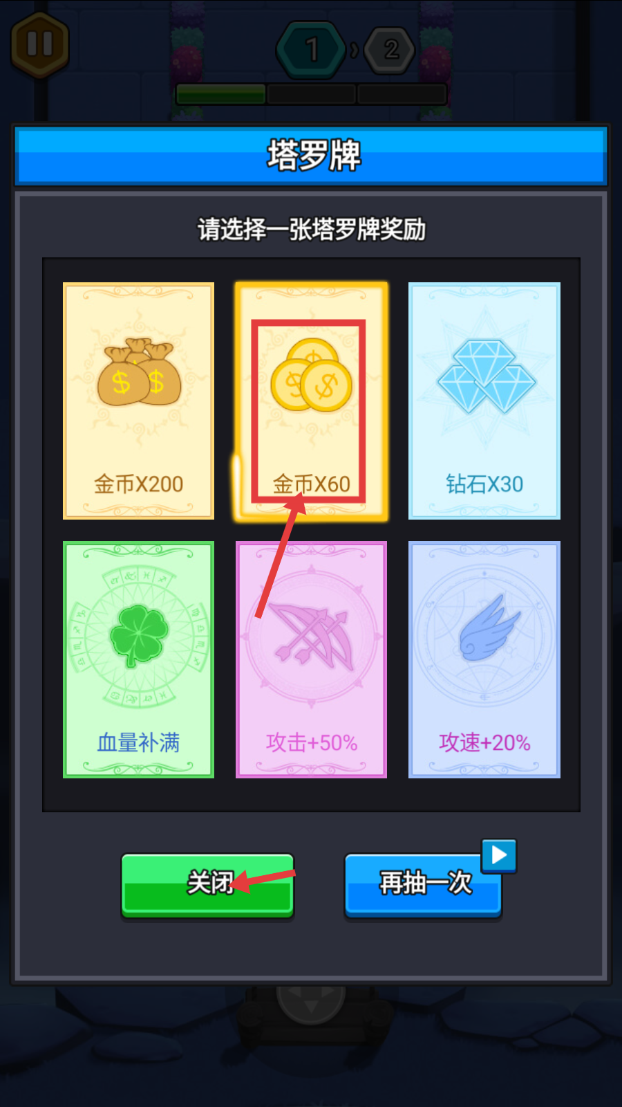 4、在【塔罗牌】奖励选择界面,可根据需求选奖励,若暂无需特殊增益,选金币类也不错。