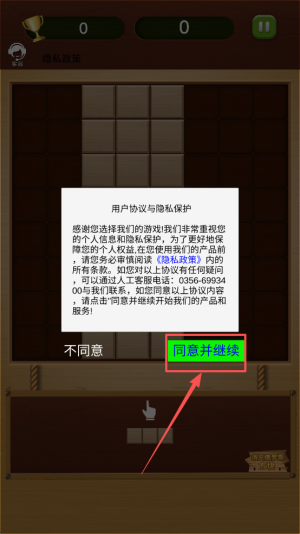 1、首先,阅读并同意游戏的用户协议与隐私保护,点击“同意并继续”按钮以开始游戏。