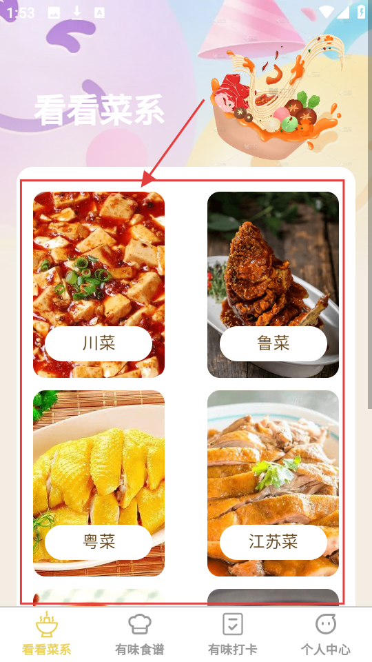 1、进入看看菜系页,可选择【川菜】【鲁菜】【粤菜】【江苏菜】等心仪菜系,进入对应菜系介绍页。