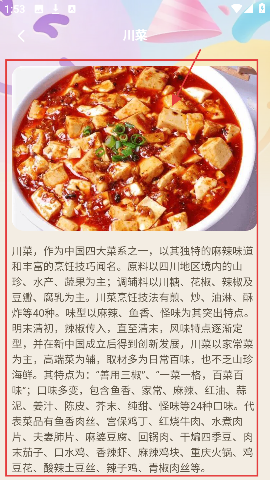 2、进入【川菜】介绍页,能了解其作为中国四大菜系之一的麻辣味道、烹饪技巧、原料及代表菜品等。