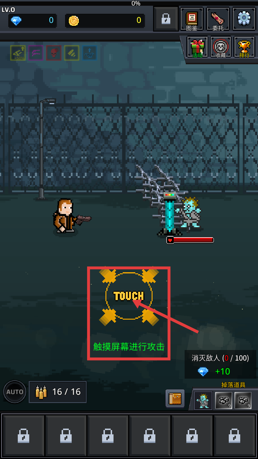 1、战斗时触摸屏幕进行攻击,能有效打击敌人,推进【消灭敌人-0/100】任务进度。