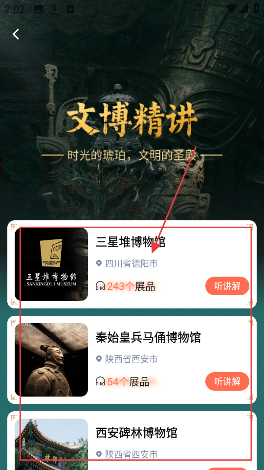 2、进入【文博精讲】页,能看到三星堆博物馆、秦始皇兵马俑博物馆等,可点击【听讲解】了解。