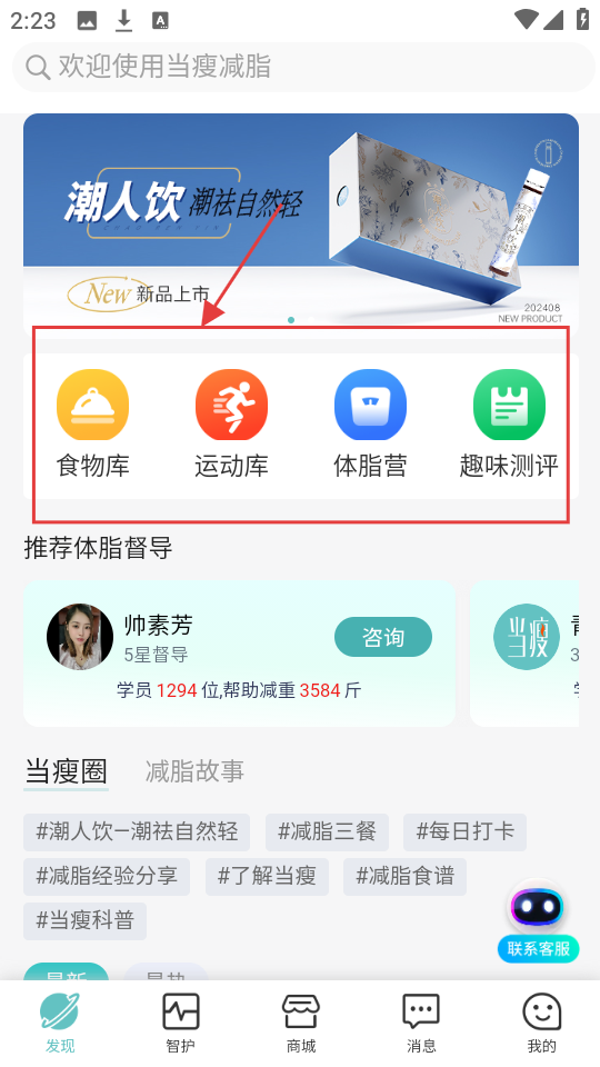 1、进入应用,可从【食物库】【运动库】【体脂营】【趣味测评】中选功能,开启减脂相关操作。