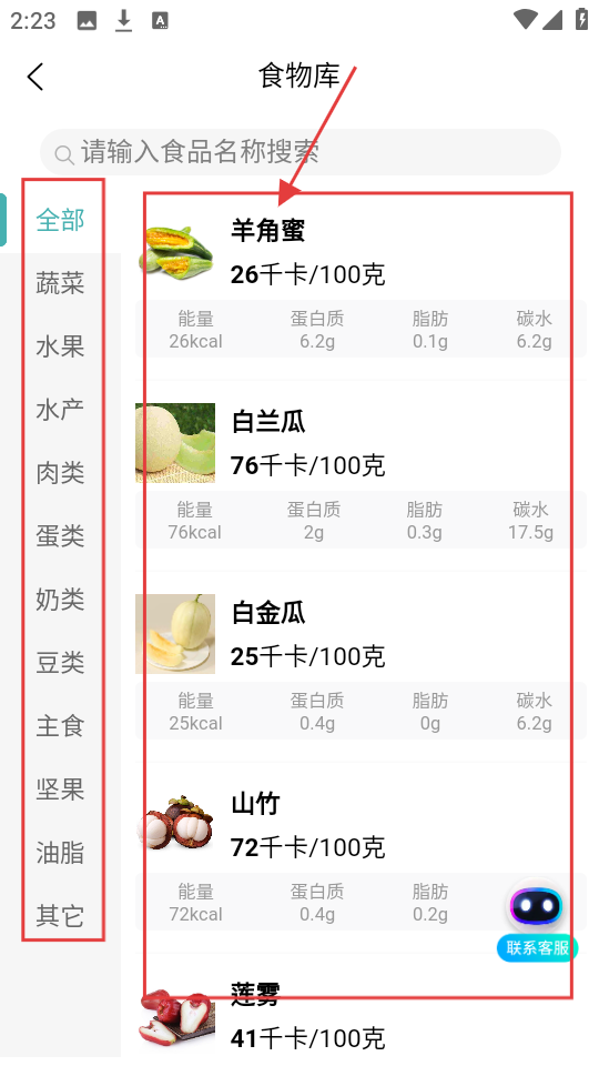 2、进入【食物库】,能按分类(蔬菜、水果等)或搜索找食物,查看羊角蜜等食物的热量等信息。