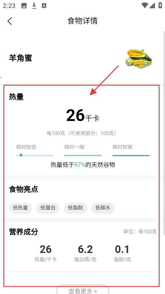 3、点击羊角蜜,进入食物详情页,可查看其热量(26千卡)、食物亮点及营养成分等内容。