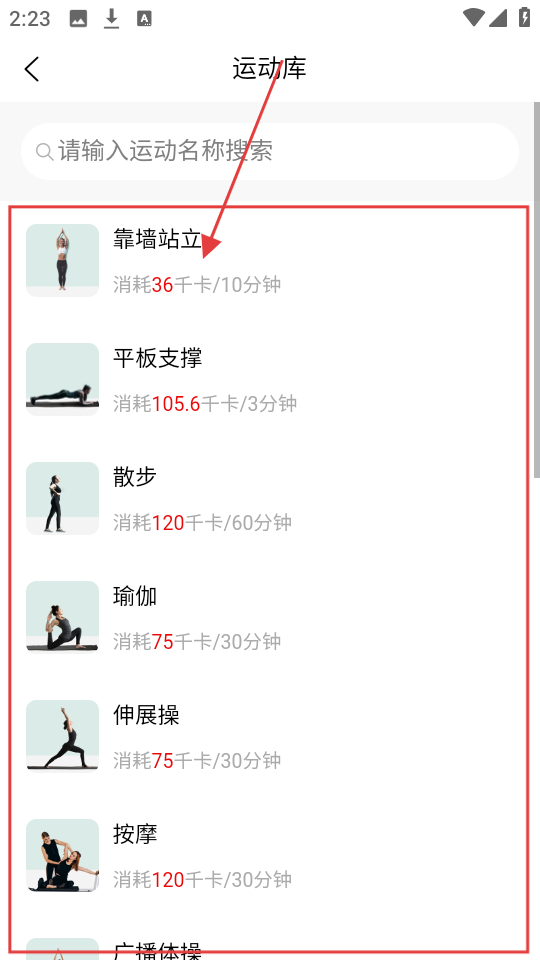 4、进入【运动库】,可查看靠墙站立、平板支撑等运动的热量消耗情况,选择适合的运动。