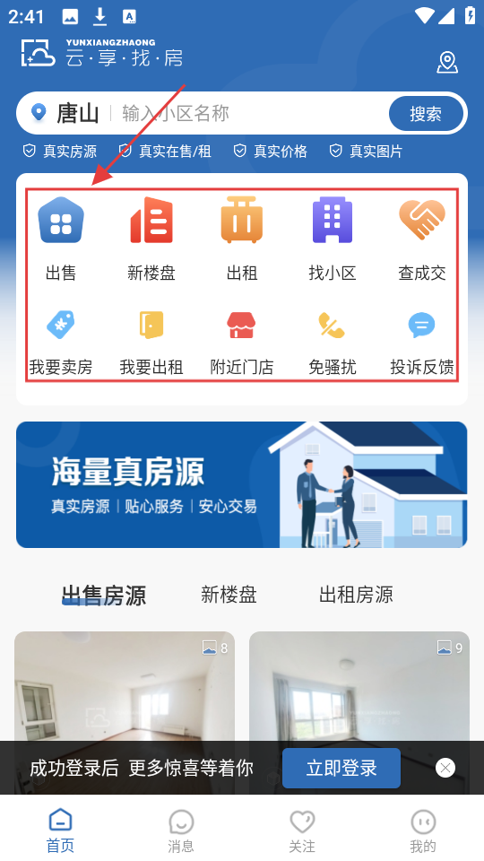 1、进入【云享找房】首页,可从【出售】【新楼盘】等功能里选,开启找房相关操作。