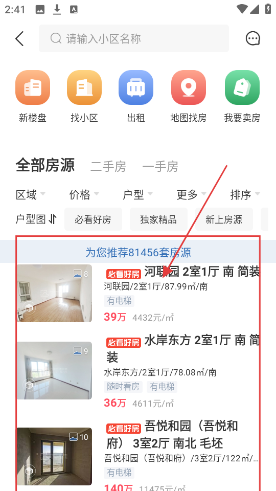 2、选对应房源分类后,浏览推荐房源列表,找到感兴趣的房源(如河联园2室1厅)点击进入。