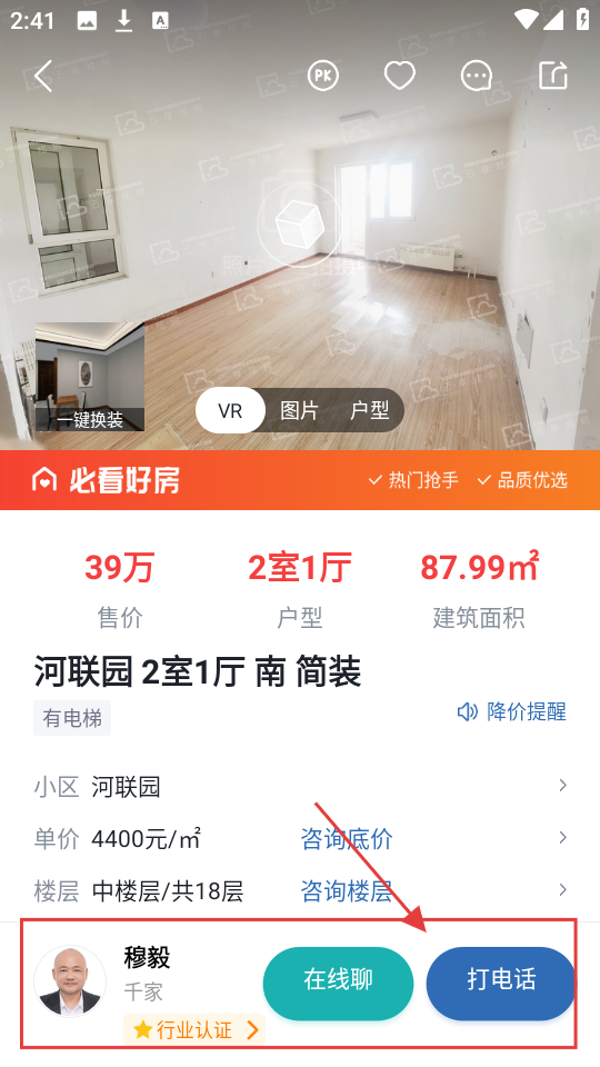 3、进入房源详情页,查看售价、户型等信息,可通过【在线聊】或【打电话】联系经纪人。