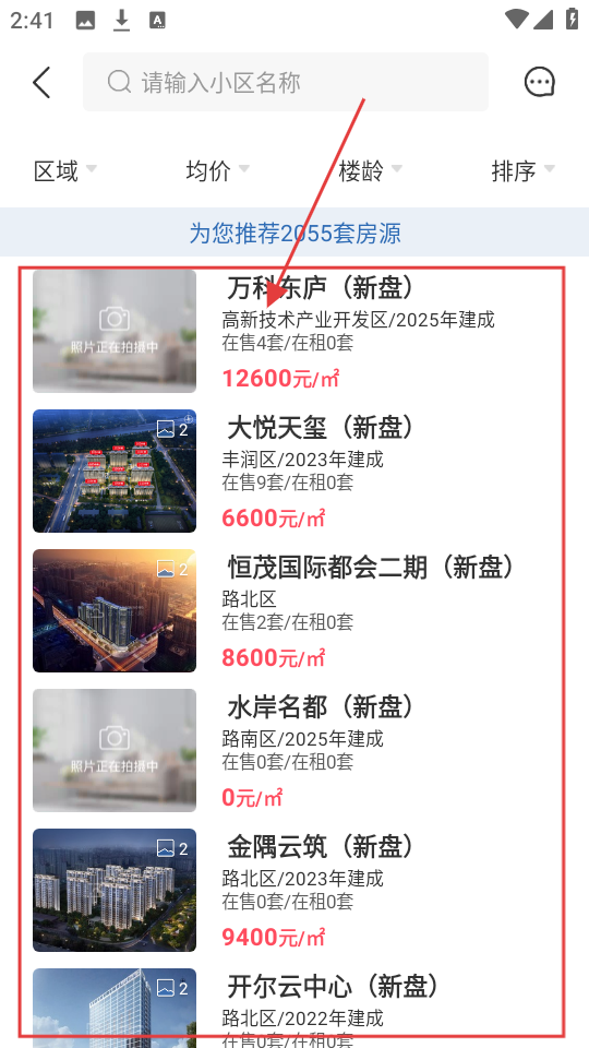 4、若关注新盘,可在新盘列表里,查看万科东庐、大悦天玺等新盘的价格、建成时间等。