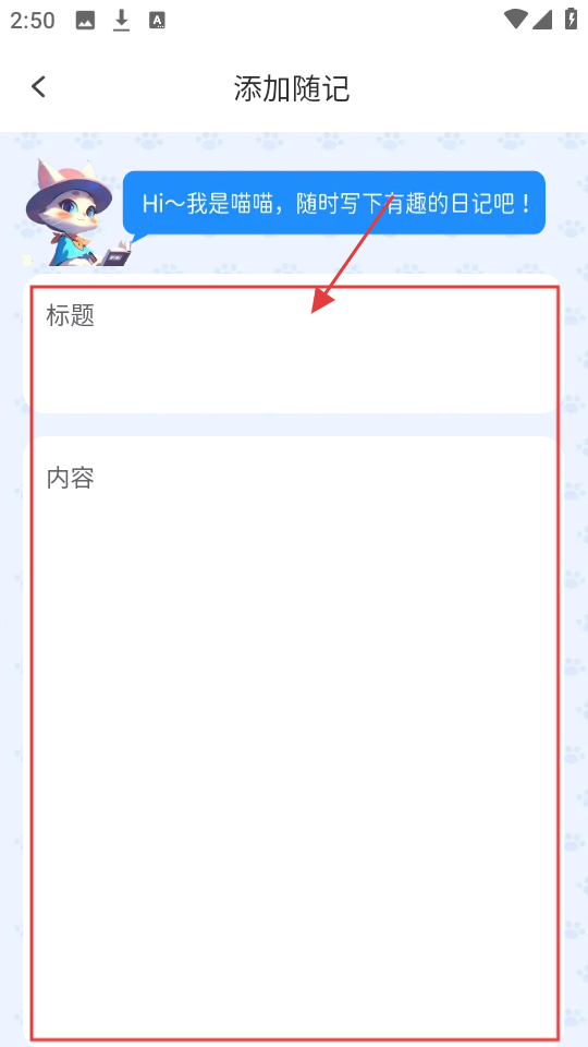 2、在【添加随记】页,填写【标题】和【内容】,记录旅行中的有趣日记。