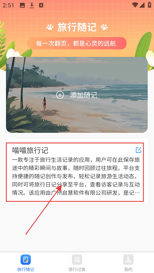 喵喵旅行记是一款专注于旅行生活记录的应用,用户可在此保存旅途中的精彩瞬间与故事,随时回顾过往旅程。平台支持便捷的随记创作与发布,轻松记录旅游生活动态,同时可将旅行日记分享至平台,查看访客记录与互动情况。该应用由广州启慧软件有限公司研发,是记录旅行回忆的实用工具。