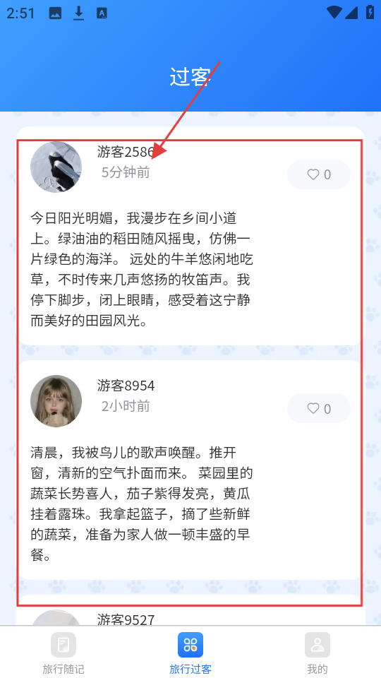 4、切换到【旅行过客】页,能浏览其他游客分享的旅行随记,感受不同的旅行故事。