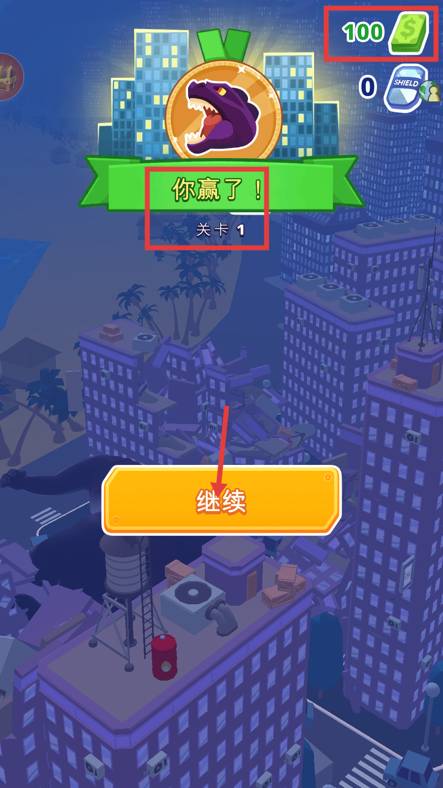 4、成功击败巨兽后,会显示【你赢了!】,获得金币奖励,点击【继续】可进入后续游戏内容。