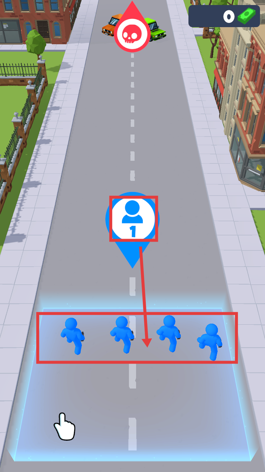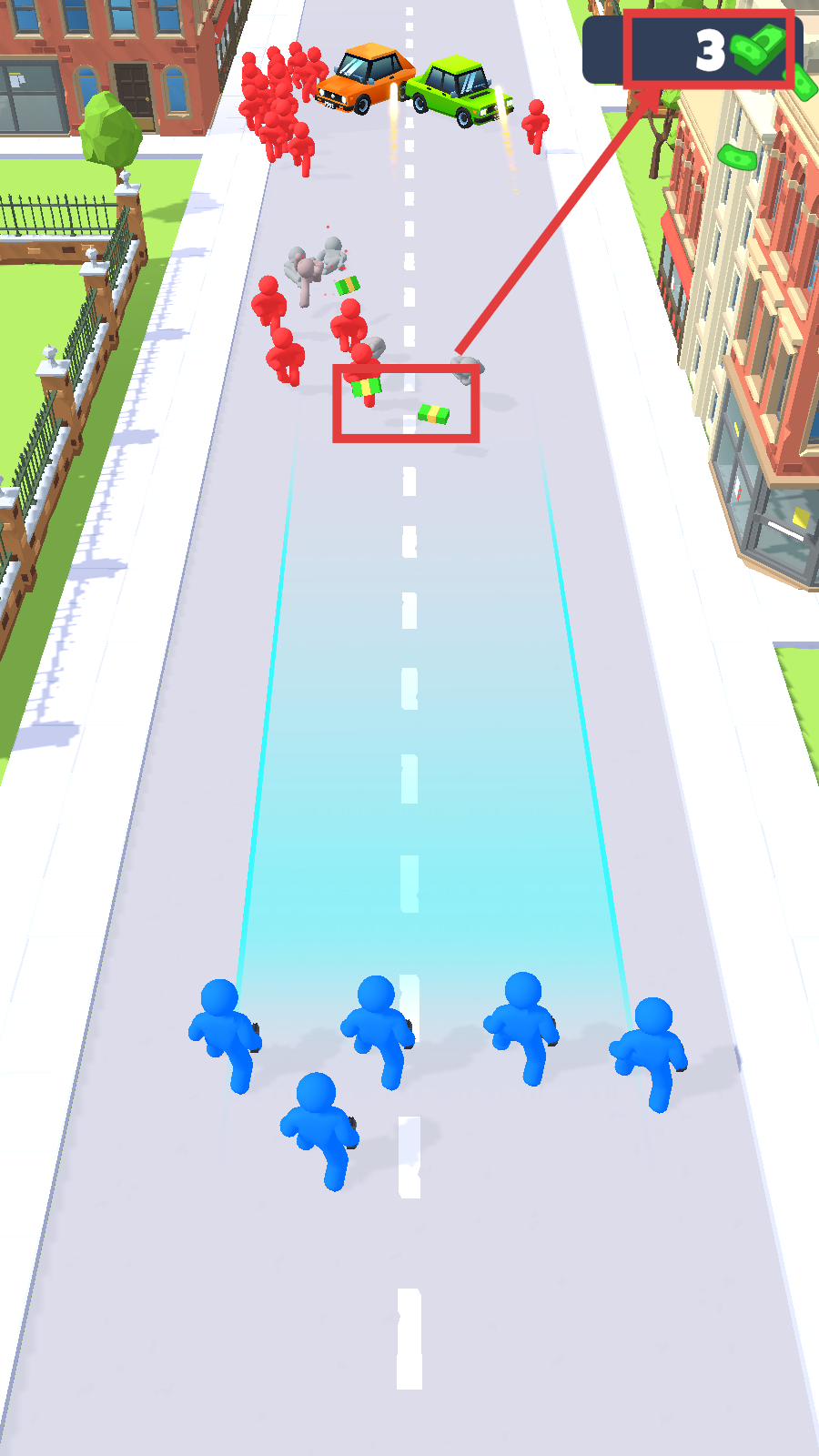 3、收集道路上绿色钞票堆数字【3】,表示金钱数量点击收集,增加资源为后续升级或战斗提供经济支持。